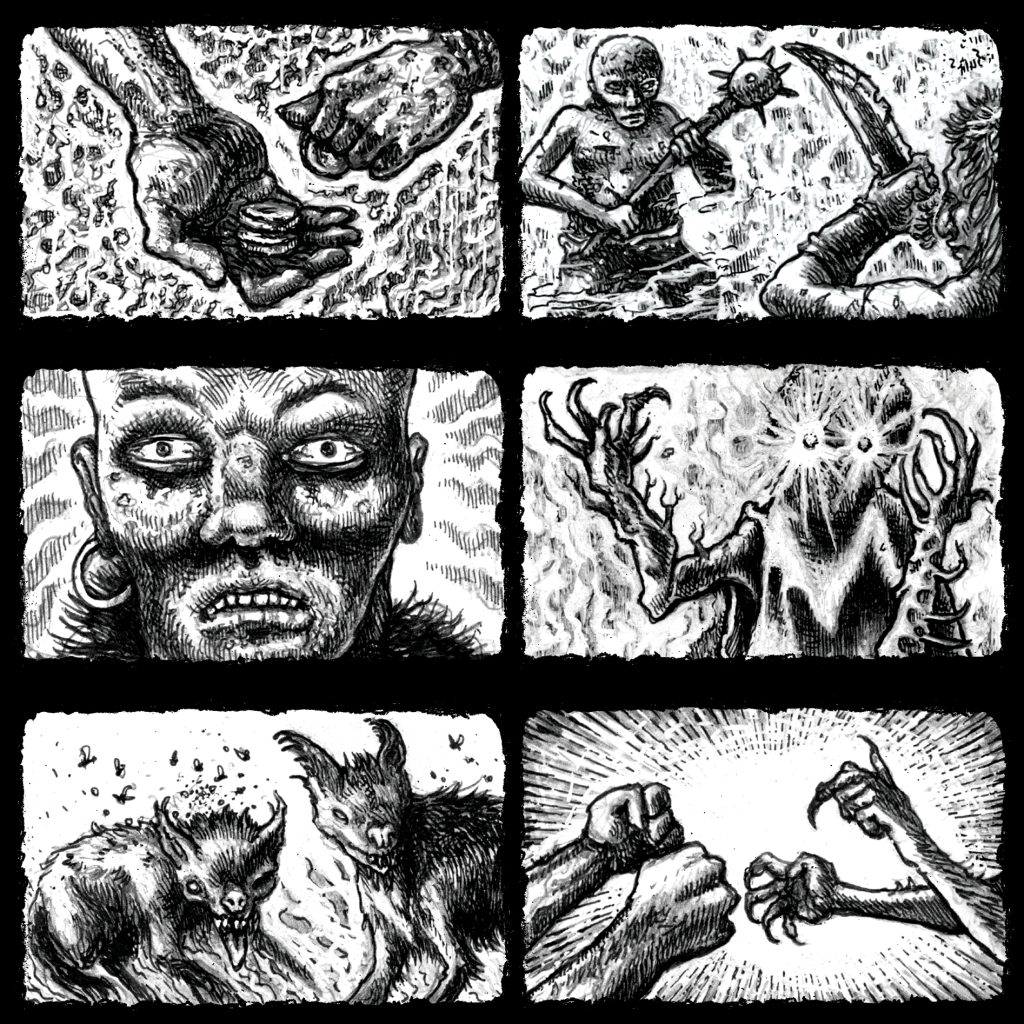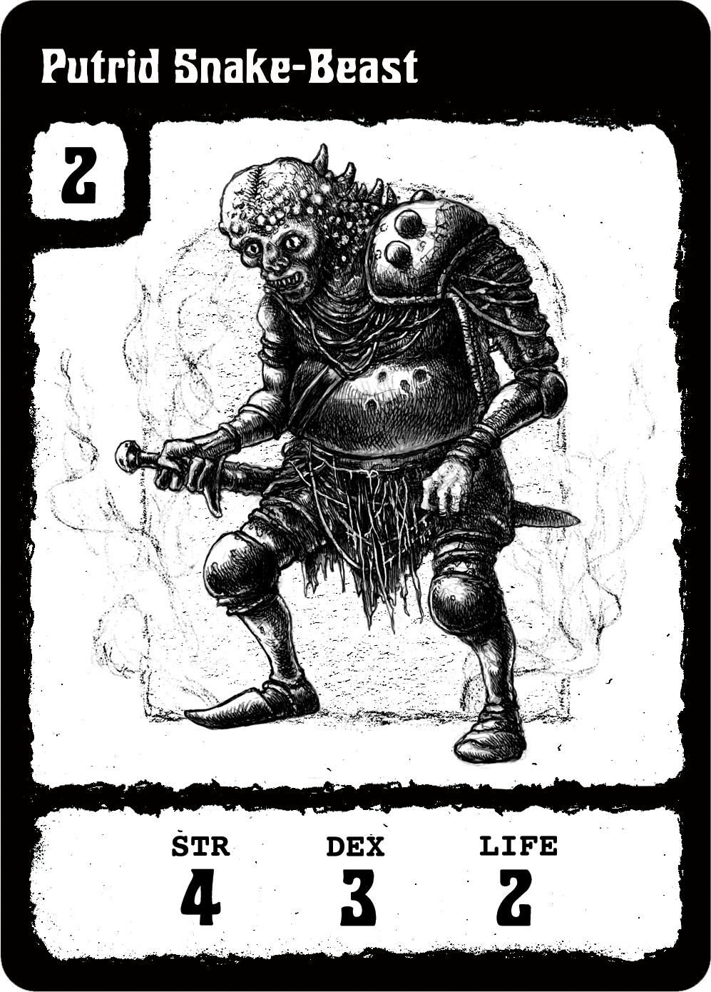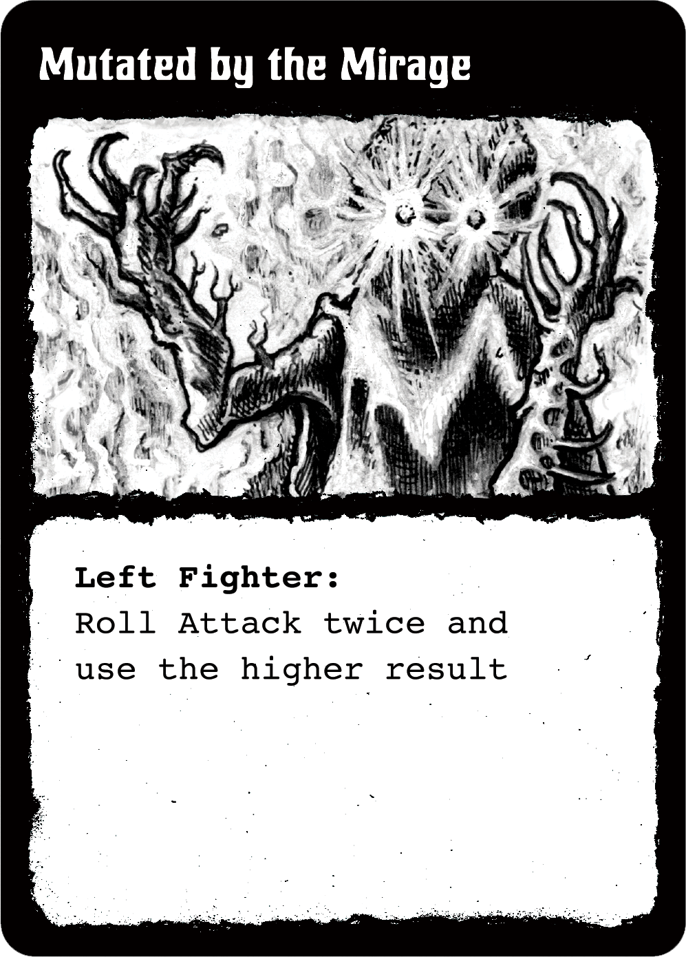 The first thing that will likely strike you upon encountering this beast is the evocative monochromatic artwork of Eric Radey (co-designer of Dungeon Degenerates). It oozes filth, recalling the classic vibes of old-school Fighting Fantasy and its ilk, and does a perfect job in setting the tone for this grim and satirical affair. It is the art that does the heavy lifting in terms of evocation, as it splashes the silhouettes of grisly combatants across a deck of curiosities, six of which will face off in pairings of two throughout each round of the game.