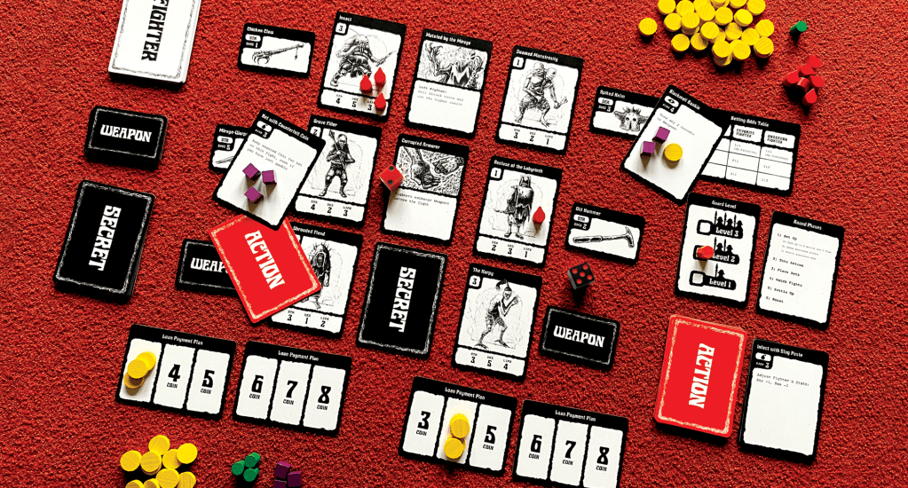 Contenders will be paired from a menagerie of the desperate and the blood-starved, assigned weapons, and subject to a ‘mystery’ card that dictates the conditions of their bout. All of these elements are assigned at random and kept hidden from the players. Herein lies the game.